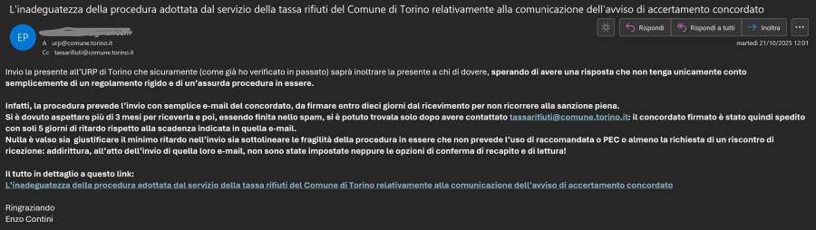 L’inadeguatezza della procedura adottata dal servizio della tassa rifiuti del Comune di Torino relativamente alla comunicazione dell’avviso di accertamento concordato