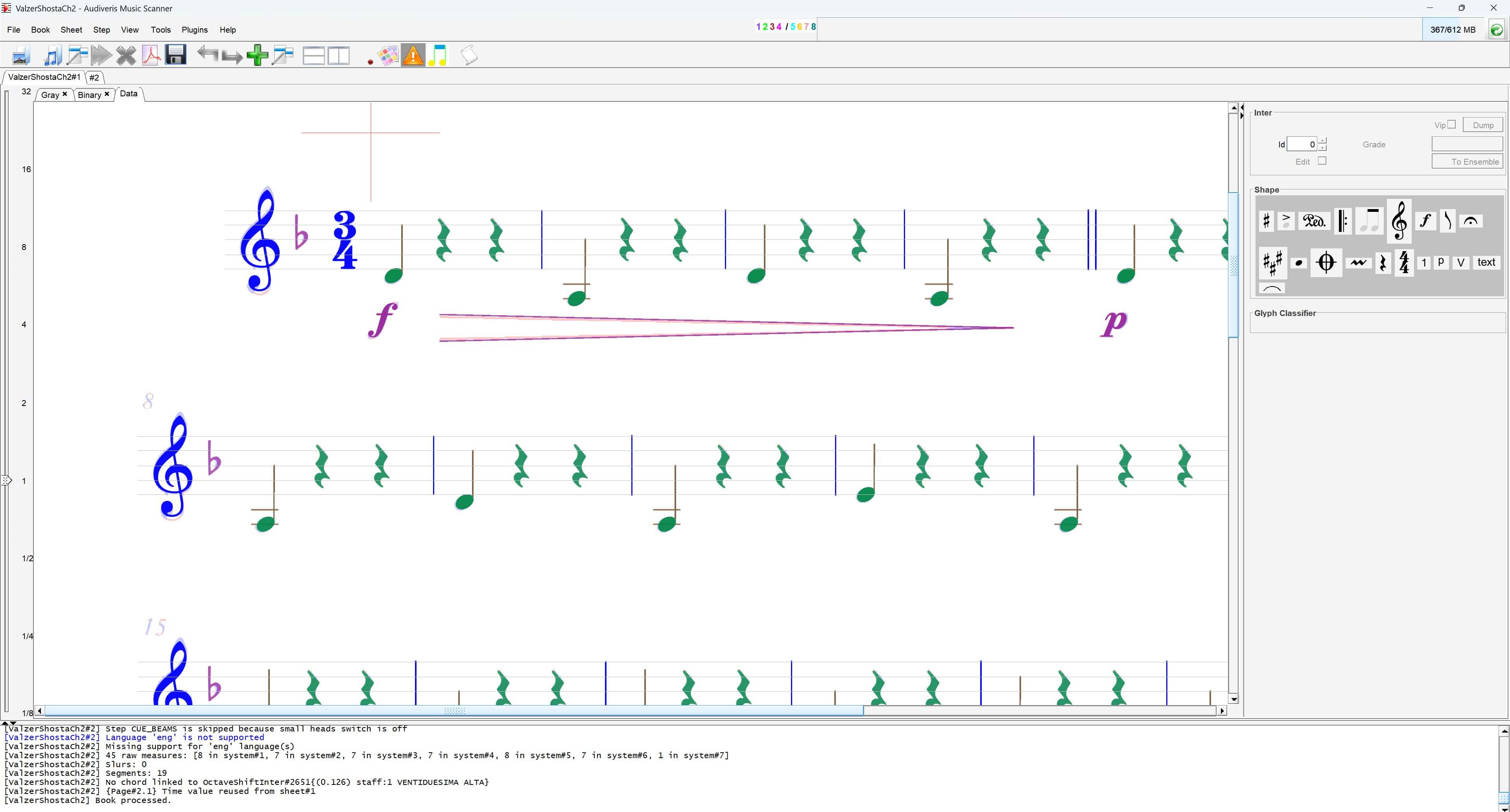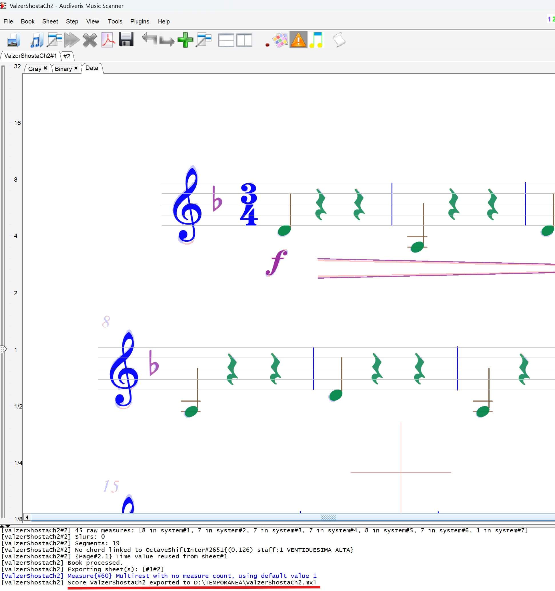 Con Audiveris apre il file che contiene lo spartito, ad esempio nel formato .pdf o come immagine, e quindi si preme il pulsante triangolare di play per attivare il processo di riconoscimento che procede passo passo, riconoscendo un po’ per volta le note e le notazioni musicali. In basso c’è una finestra di log che mostra ciò che sta avvenendo e che segnala anche eventuali anomalie durante il processo: