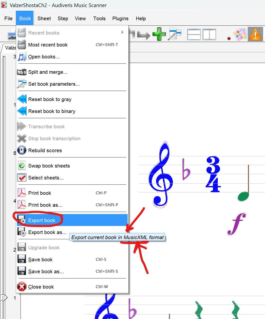 Quindi si esporta il tutto in un file in formato MusicXML (Book -> Export Book) in modo da poterlo poi aprire con un editor per musica.