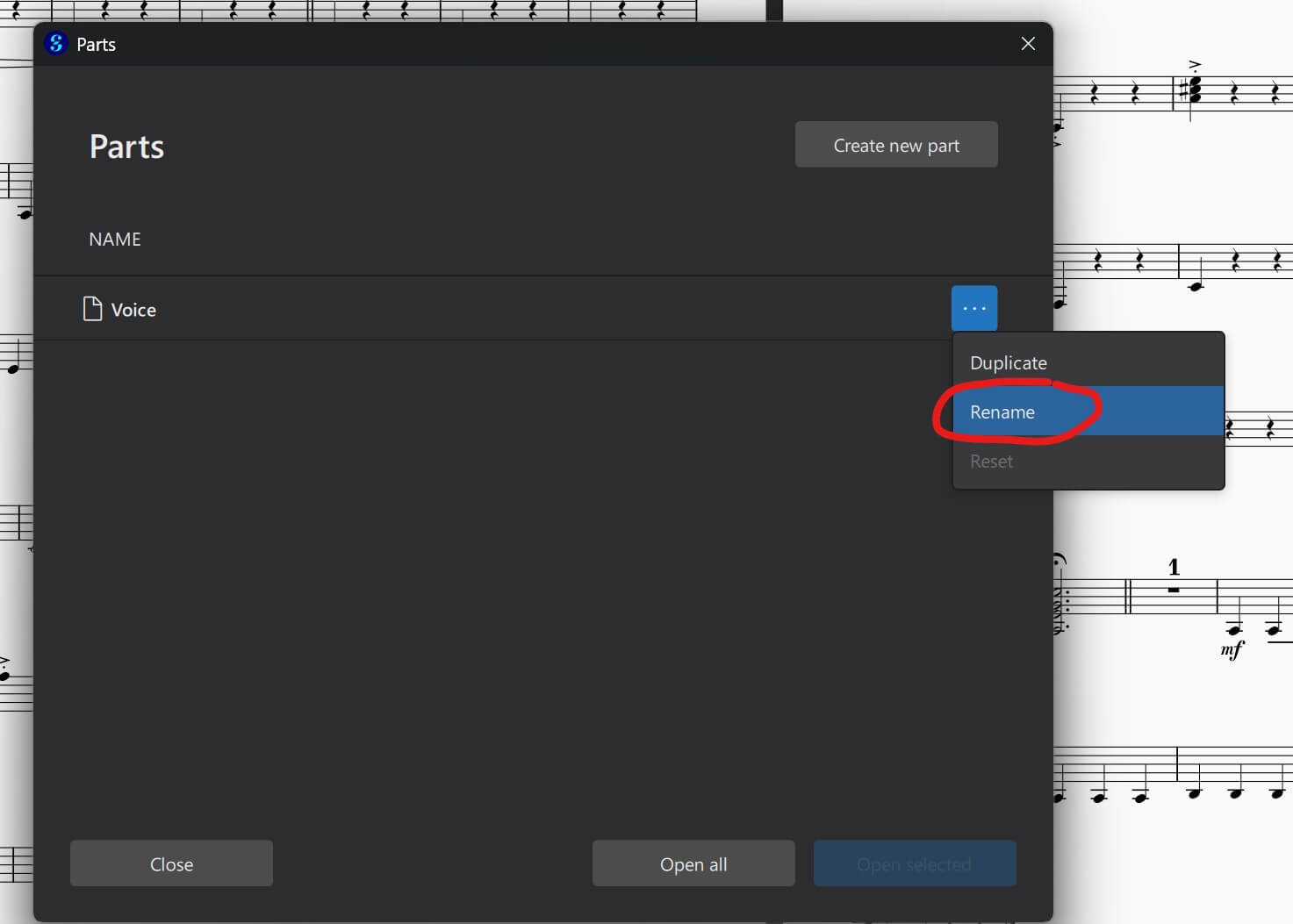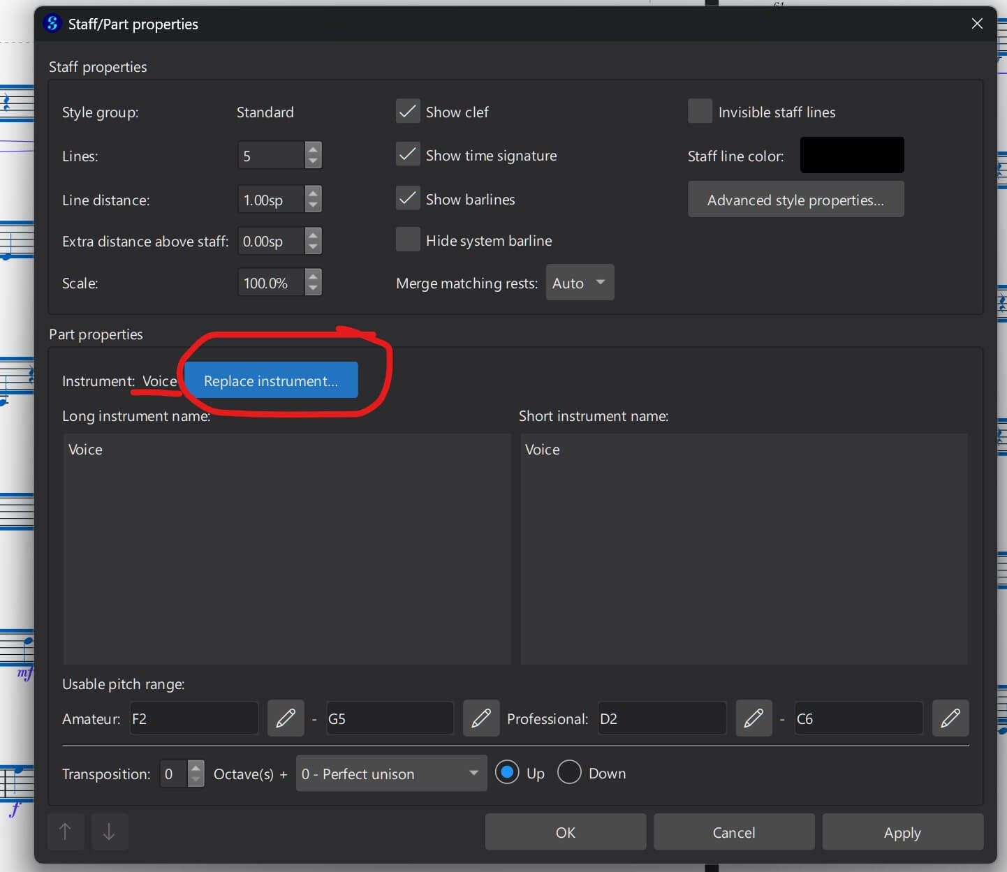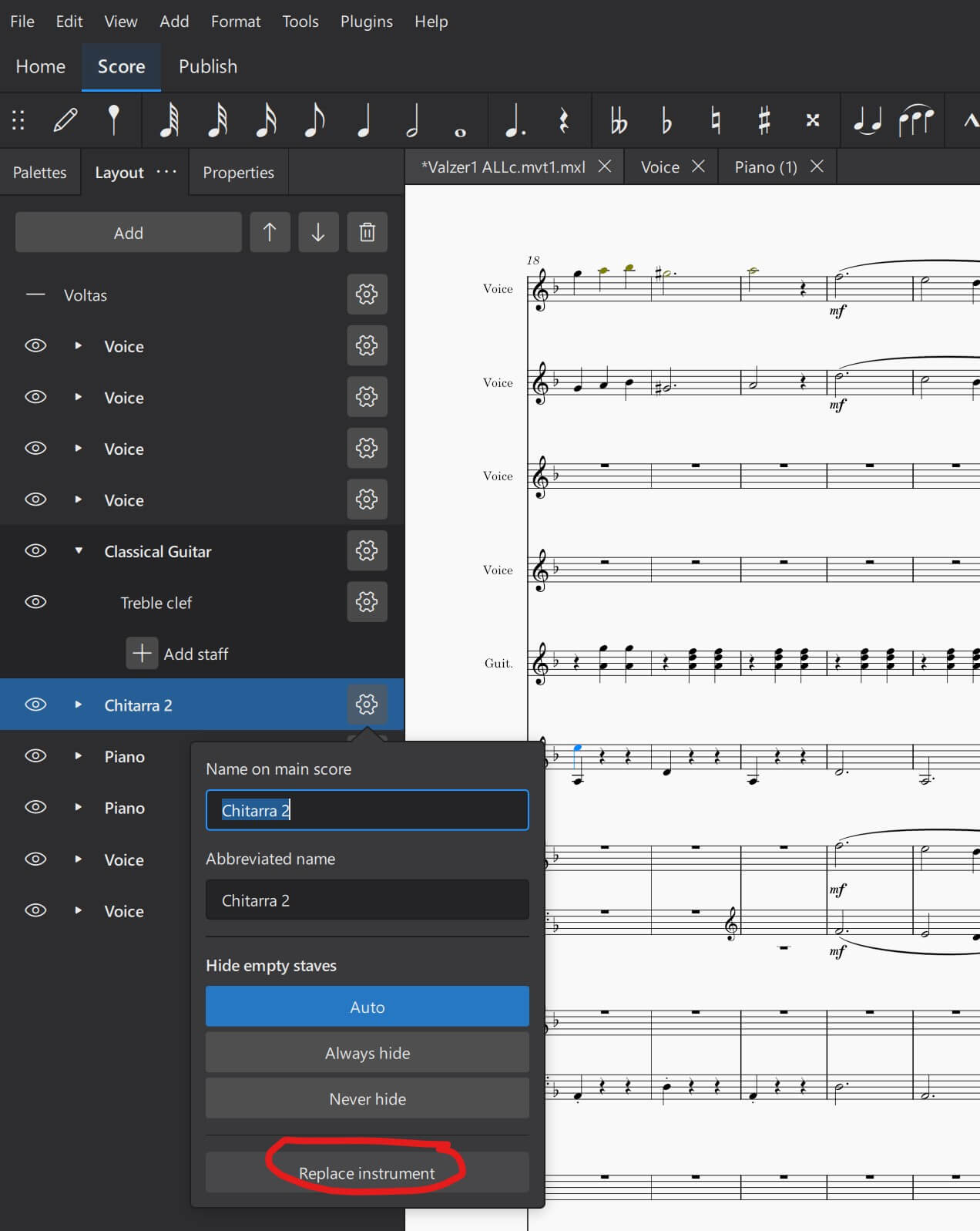 Come mi aspettavo, il file dello spartito, scansionato e salvato in quel formato standard, è stato perfettamente riconosciuto da MuseScore: l’unica modifica che ho dovuto apportare è stata relativa allo strumento a cui quella parte era stata assegnata di default (voce), operando dalle opzioni di quel programma. Selezionando il rigo musicale e quindi cliccando con il tasto destro sul fondo, compare un menù con anche una voce che consente di impostarne le proprietà (Staff/part properties) tra cui lo strumento associato: qui si può scegliere tra tutti gli strumenti disponibili (e.g. archi, fiati, chitarre, percussioni). Le note rimangono le stesse, ma verranno riprodotte con il timbro del nuovo strumento selezionato (e.g. chitarra classica): è possibile anche cercare direttamente il nome dello strumento. Confermando con OK, MuseScore aggiornerà il nome del rigo e il suono associato (playback). Si può anche rinominare ciascuna “parte” in modo appropriato.