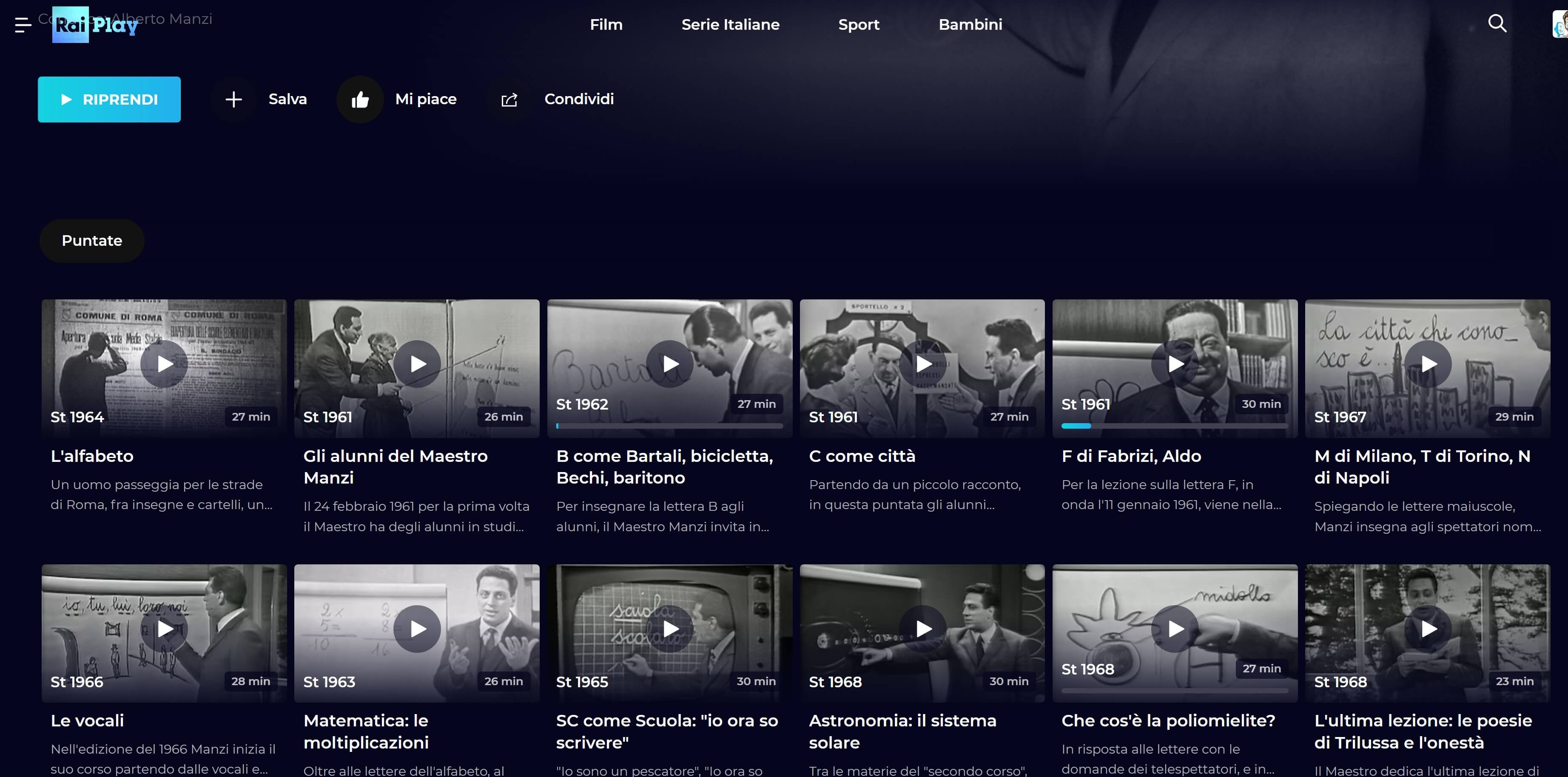 Quindi anche quella serie televisiva l’avevo vista in bianco e nero, sdraiato per terra davanti alla TV che in quegli anni trasmetteva non certo molti programmi per i bambini, ma quei pochi erano comunque di sostanza e di qualità. Si pensi alla trasmissione “Non è mai troppo tardi“, pensato per essere un corso di alfabetizzazione per adulti analfabeti, condotto dal maestro Alberto Manzi, ma visto anche da molti bambini come me, che ho infatti imparato a scrivere e a leggere grazie anche a quella trasmissione! Una trasmissione che ha avuto la prima puntata il 15 novembre 1960 ed è durata fino al 1968. Mi viene da chiedere perché mai sia stata interrotta e addirittura perché non sia più disponibile oggi che esiste la necessità di insegnare l’italiano agli immigrati: sarebbe sicuramente di aiuto! Comunque, ho visto che su RaiTechne e su RaiPlay sono disponibili alcune lezioni di esempio come valenza storica, tuttavia troppo poche per avere una continuità didattica.