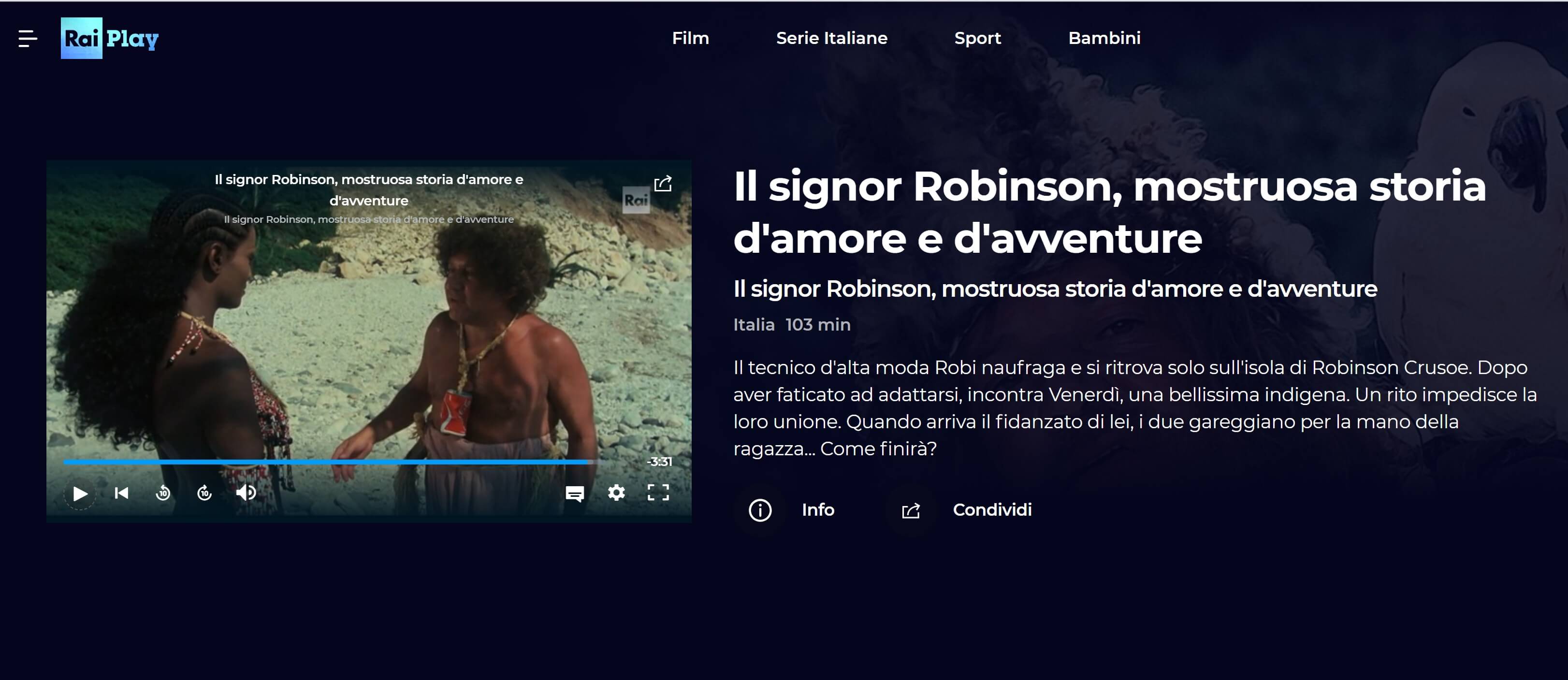 Infine, ho cercato su RaiPlay se per caso ci fosse la versione RAI della serie TV… ma non l’ho trovata! Ho però visto che c’è il film con Paolo Villaggio che è un po’ la parodia di quello sceneggiato: Il signor Robinson, mostrosa storia d’amorte e di avventura: anche quello da rivedere, pur nella sua comicità scontata, ma non per questo banale!
