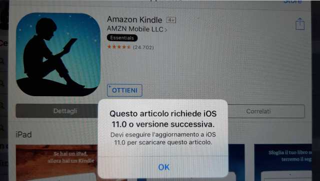 I tried to download and install the Amazon Kindle app in a five years old iPad Air (A1460 model) and, with my surprise, the following message appears: “This article requires iOS 11.0 or higher version. You need to update to iOS 11.0 to download this article“.