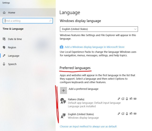 Si noti che se più si sono impostate più lingue, il correttore ortografico di Windows cerca, se possibile, di non evidenziare potenziali errori ortografici se la parola scritta è corretta almeno in una di quelle lingue installate (non necessariamente per quella attualmente impostata come attiva): perciò se per esempio si sono installate le lingue italiano ed inglese (US), non verrà segnalato nulla se si scrivono parole ortograficamente corrente per una di quelle due lingue (e.g. per “questa è una home di countryside” non verrà segnalato alcun errore ortografico).