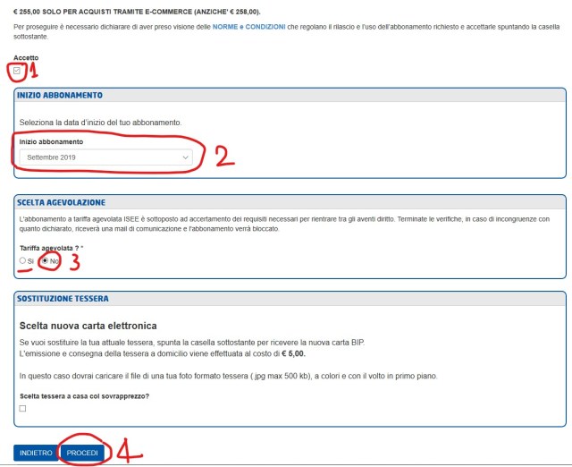 Nel seguito riporto alcuni screenshot che mostrano tutta la procedura passo-passo dopo che l’utente si è registrato con il proprio account collegato alla BIP card posseduta: risultano agevoli e tipici di un qualsiasi acquisto online tramite una carta di credito.