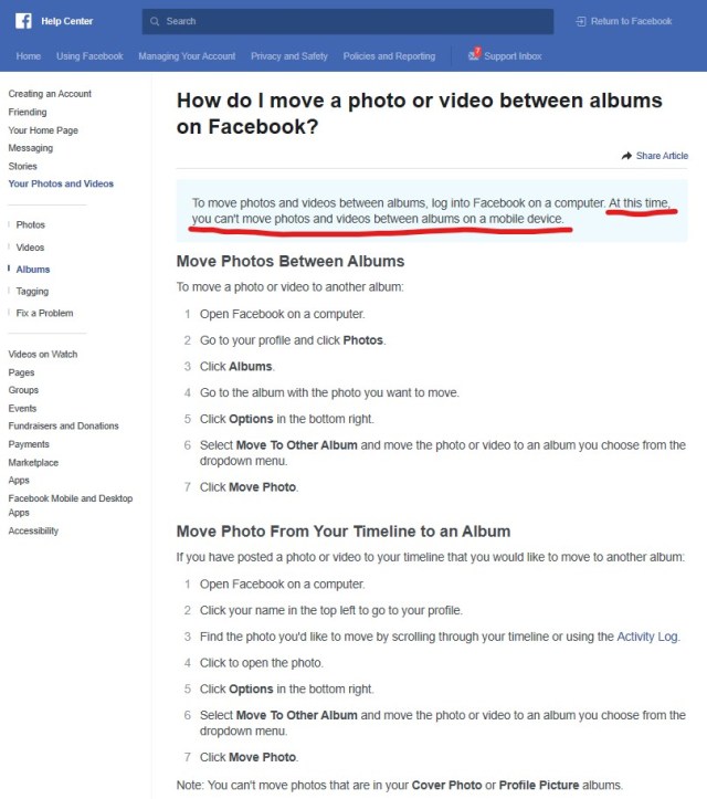 Final note: the information provided in the Facebook Help Center is confusing. It speaks only about the impossibility of “moving photos and videos between albums on a mobile device“, but it says nothing related to posts with more images uploaded!