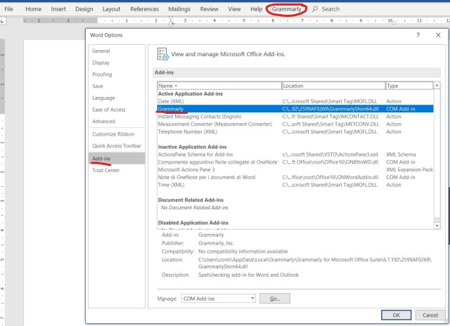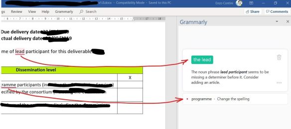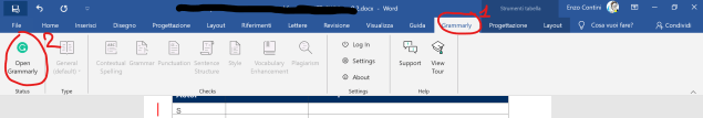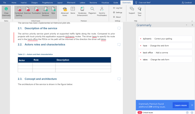 Once the plug-in is installed, a specific Grammarly voice in the menu will be available and, when requested, a window on the right will show the detected errors andd several Grammarly options will be avaìilable on the top menu: