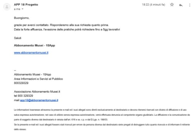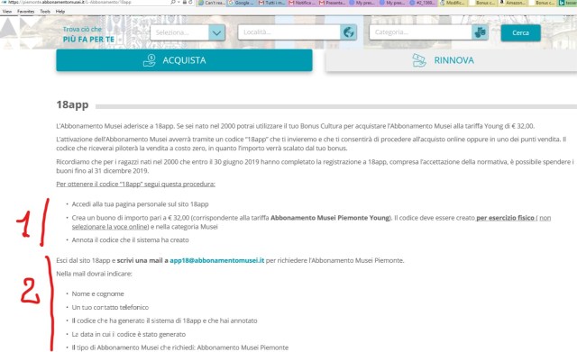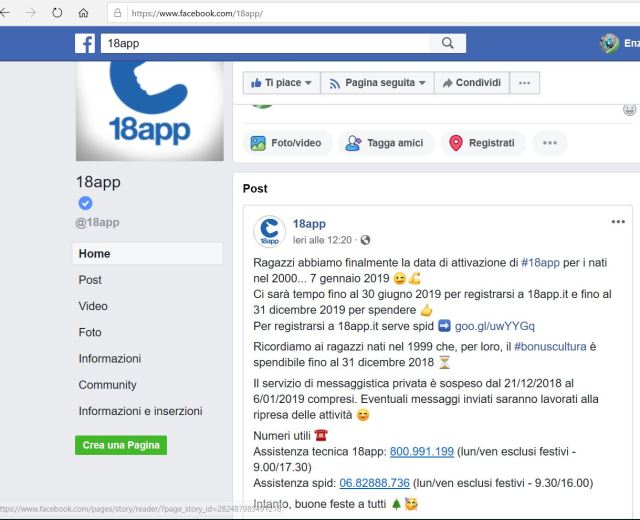 Finalmente solo pochi giorni fa, precisamente il 22 dicembre 2018, sul sito Facebook governativo 18app è stato inserito il post che ci aspettavamo da mesi: “Ragazzi abbiamo finalmente la data di attivazione di #18app per i nati nel 2000 … 7 gennaio 2019💪Ci sarà tempo fino al 30 giugno 2019 per registrarsi a 18app.it e fino al 31 dicembre 2019 per spendere👍 Per registrarsi a 18app.it serve spid ➡️goo.gl/uwYYGq. Ricordiamo ai ragazzi nati nel 1999 che, per loro, il #bonuscultura è spendibile fino al 31 dicembre 2018 ⏳ .Numeri utili ☎️ Assistenza tecnica 18app: 800.991.199 (lun/ven esclusi festivi – 9.00/17.30) Assistenza spid: 06.82888.736 (lun/ven esclusi festivi – 9.30/16.00)“