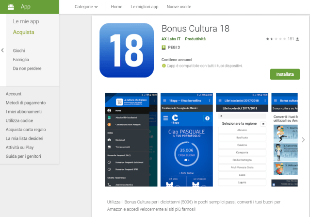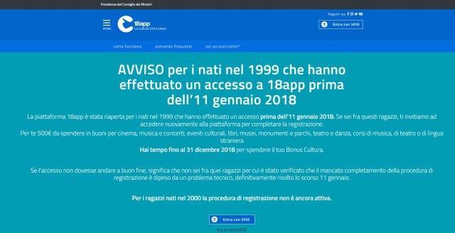 Tuttavia, se poi uno andava a vedere in dettaglio, notava subito che l’app18 risultava usufruibile solo per i nati nel 1999/98. Inoltre, nella pagina Facebook di 18app, il 5 febbraio 2018 c’era scritto: “Attenzione! Ricordiamo a tutti i ragazzi che compiono 18 anni nel 2018 che, al momento, non è possibile registrarsi a #18app perché il #bonuscultura per i nati nel 2000 non è ancora attivo! Come per le precedenti edizioni, l’attivazione avverrà solo successivamente alla pubblicazione del decreto attuativo. Quello che puoi fare, se hai già compiuto 18 anni, è richiedere #spidgoo.gl/eYVBGu“.