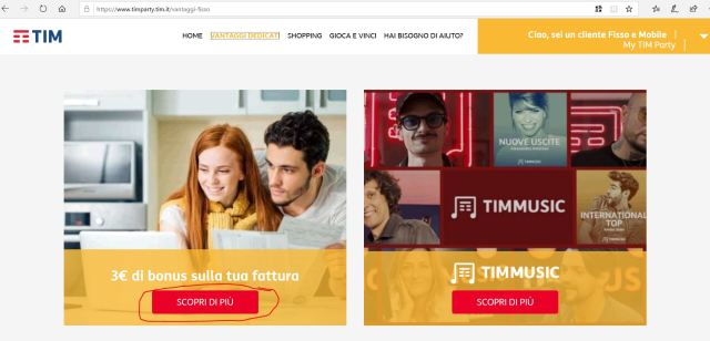 Nella homepage di TimParty viene subito proposto di aderire all’offerta dello sconto di 3€ sulla prossima bolletta premendo semplicemente il tasto ATTIVA.