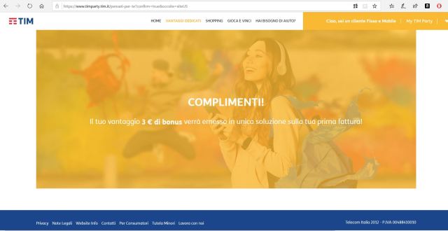 P.S. 23/1/2019 – L’offerta del medesimo sconto di 3€ viene riproposta anche per la prossima bolletta, con analoga procedura! Nell’SMS ricevuto per notificare l’emissione della fattura corrente, viene infatti nuovamente indicato di accedere al sito timparty.it per riscuotere nuovamente l’omaggio anche sulla bolletta successiva!