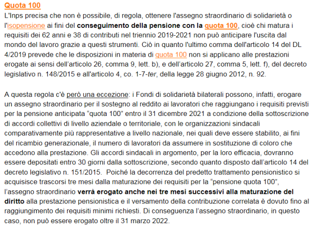 Non è ancora chiaro del tutto chiaro se Quota 100 e Isopensione siano incompatibili, ovvero se l’unico modo che ha l’azienda per fare uscire le persone in Quota 100 (al 31 12 2021) sia il meccanismo dei Fondi di Solidarietà.