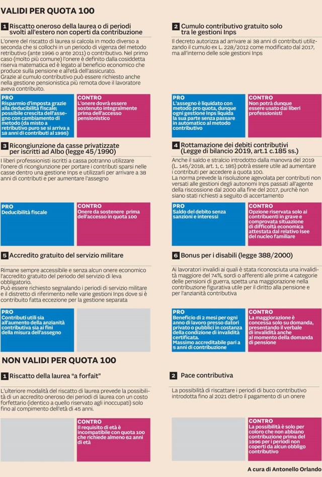 Pensioni quota 100, cinque strade per aumentare i contributi (Il sole 24ore) Pensioni Quota 100, le nuove condizioni del decreto: ritiro possibile a 57 anni (Corriere della sera). Lo stesso articolo afferma che la legge consente alle aziende, «a loro carico e previo versamento agli stessi Fondi della relativa provvista finanziaria» di poter provvedere anche al riscatto di periodi «utili per il conseguimento di qualunque diritto alla pensione anticipata o di vecchiaia». In pratica, attraverso i fondi bilaterali si può riscattare anche il corso di laurea.