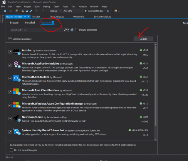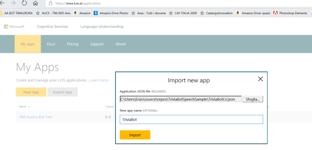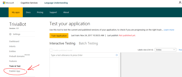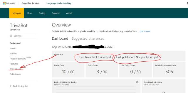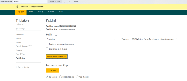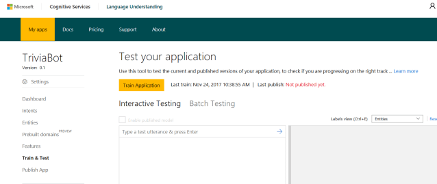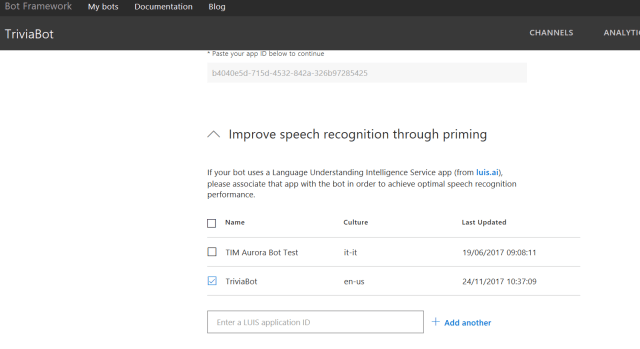 [Optional] To improve speech recognition for your bot: on http://dev.botframework.com/ go to the bot’s settings. In the “Speech recognition priming with LUIS” section you should see a list of LUIS apps associated with the account you are logged in with. Check the new LUIS app you created for this bot and hit save. This information is used to improve speech recognition when you speak to this bot and uses the Cognitive Speech apis for speech recognition. Speech recognition priming improves the recognition accuracy for the utterances and entities defined in your LUIS app for this bot.