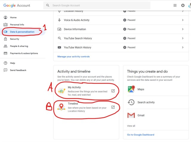 An other way to reach your data/activities is to choose theData & Personalization item of the left menu of your Google Account homepage. In the Activity and timelinesection box, you can go to see My Activity section or the Timeline one (Google maps tracing).