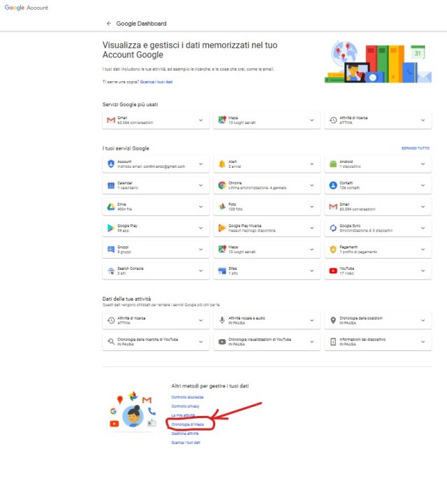 In the following there is the Google Dashboard page that allows you to manage all your data available in your Google Account. In particular, at the bottom of the page there are My Activityand Maps timelinelinks.
