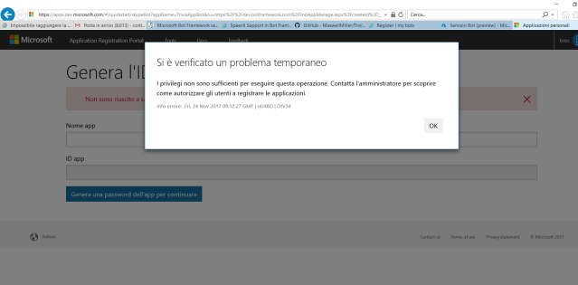 If you are trying to create a ID/password with your MSDN subscription done by your company, you will possibly receive the following error due to insufficient privilege: because I needed that codes only for a trial and not to publish a company app, I solved the problem generating them with my personal Microsoft account.
