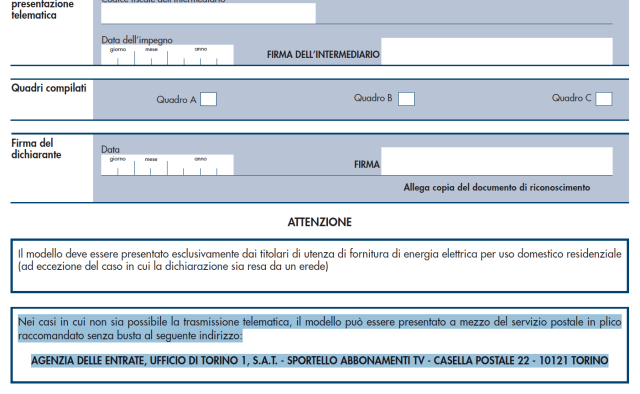 Ad esempio da questo sito si leggono le istruzioni precise di come effettuare il tutto: Bisogna prendere i fogli da spedire spillati tra loro, avendo cura di mantenere l’ultima facciata, quella posteriore, completamente bianca. Il plico di figli va piegato in tre parti a soffietto in 3 sezioni di uguale dimensione avendo cura che la parte scritta rimanga all’interno e la parte bianca esterna. Il soffietto creato dal plico può essere chiuso da un punto di spillatrice sui lati più corti, per fare in modo che non venga aperto e letto. Sulla parte bianca scrivere l’indirizzo del destinatario, in questo caso Agenzia delle Entrate Ufficio di Torino 1 S.A.T. – Sportello abbonamento tv – casella postale 22 – 10121 Torino, e andare all’ufficio postale a spedire la raccomanda con ricevuta di ritorno. La ricevuta che vi rilascerà l’ufficio postale andrà conservata insieme alla ricevuta di ritorno che riceverete dall’Agenzia delle Entrate.”