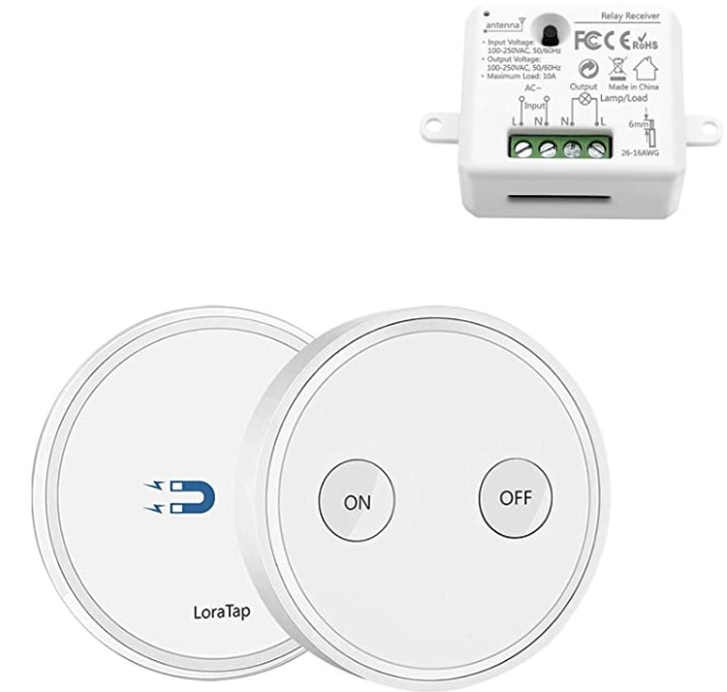 Relativamente poi all’interruttore per pilotare l’accensione della striscia, ho da tempo adottato il comodo interruttore senza fili della LoraTap. Questa soluzione fornisce un ricevitore a relè comandato via radio sia un telecomando magnetico (portata fino a 200m): quest’ultimo si può quindi anche staccare dalla sua base (che uno posiziona generalmente sul muro) per poterselo portare temporaneamente dove più comodo(e.g. su un tavolino vicino al divano), sebbene poi sia conveniente riporlo al suo posto per saperlo sempre ritrovare (basta avvicinarlo e si attacca magneticamente alla base). Sebbene questo modello non abbia la possibilità di pilotaggi da un’app dello smartphone e non usi le tecnologie più sofisticate di riconoscimento vocale (vedi Alexa: come pilotare vocalmente dispositivi di domotica quali prese e luci), la soluzione fornita da LoraTap mi è sembrata comoda ed economica! Esistono poi anche altre loro soluzioni di telecomando multiplo abbinato a più relè, o anche integrabili dentro l’interruttore murato, con pilotaggio anche tramite app e Alexa… ma questo è un altro utilizzo non sempre particolarmente utile, mentre la collocazione magnetica dell’interruttore la trovo personalmente molto appropriata e comoda.