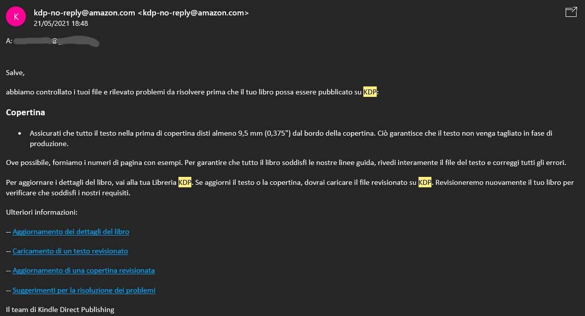 Si deve quindi attendere qualche giorno (massimo 72 ore) perché venga effettuata anche una verifica manuale che assicuri che le impostazioni grafiche effettuate rientrino nei canoni di qualità richiesti dal KDP: se ci sono delle ulteriori modifiche, si riceve una email dettagliata su come procedere per apportarle e ricaricare libro e/o copertina e richiedere nuovamente la revisione/pubblicazione.