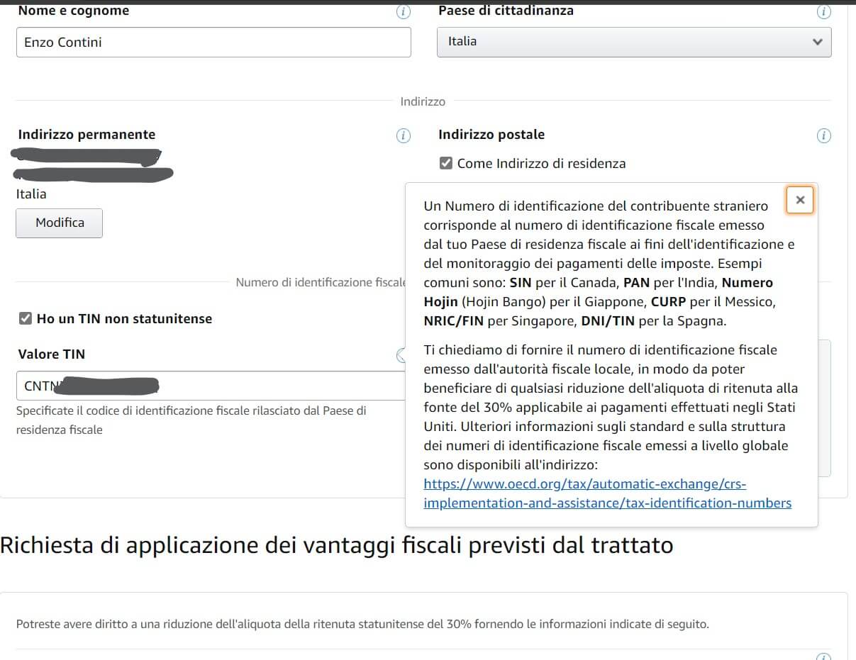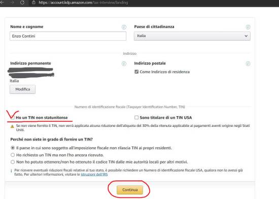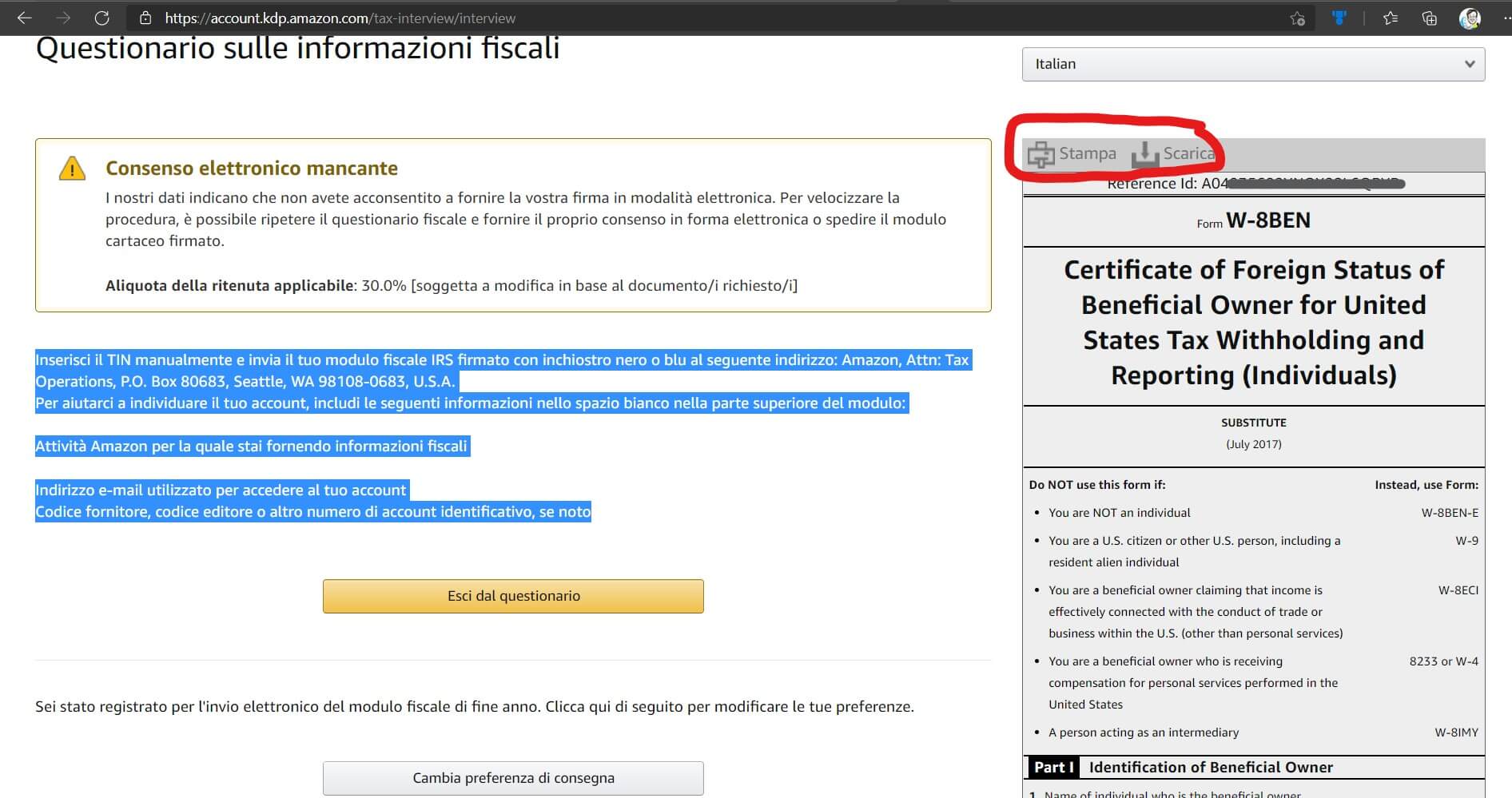Se non si specifica di avere un TIN, il modulo IRS W-8BE – che compare precompilato coi dati anagrafici forniti precedentemente – non si potrà più inoltrare semplicemente elettronicamente anche se si completa il campo mancante relativo al proprio codice fiscale: infatti non si era acconsentito all’utilizzo della firma elettronica per le informazioni fornite da modulo IRS W-8BE). Sarebbe perciò necessario stamparlo, firmarlo con penna e spedirlo all’indirizzo U.S.A. indicato (con un costo in francobolli è circa 4€ anche solo per un invio per posta ordinaria!) … indicando a penna sul bordo superiore sia il proprio username Amazon sia il motivo di quella richiesta (e.g. for KDP payment of royalties) [Viene infatti specificato: Per aiutarci a individuare il tuo account, includi le seguenti informazioni nello spazio bianco nella parte superiore del modulo: – Attività Amazon per la quale stai fornendo informazioni fiscali; – Indirizzo e-mail utilizzato per accedere al tuo account; – Codice fornitore, codice editore o altro numero di account identificativo, se noto]. Tra l’altro, in quel caso sarebbe importante firmare con penna il modulo ottenuto premendo il tasto Stampa e non quello ottenuto stampando il file che uno può scaricare premendo l’omonima icona: infatti, in quel modulo scaricato, proprio nel campo rilevante relativo al TIN, non compare il proprio codice fiscale precedentemente digitato da tastiera nel questionario, bensì un URL di un link: 😳 Sarebbe poi necessario attendere una email di avviso che tale modulo è stato elaborato manualmente una volta giunto (si spera) a destinazione! Insomma, una procedura manuale che per fortuna non è necessaria, contrariamente a quanto indicato in altri blog…