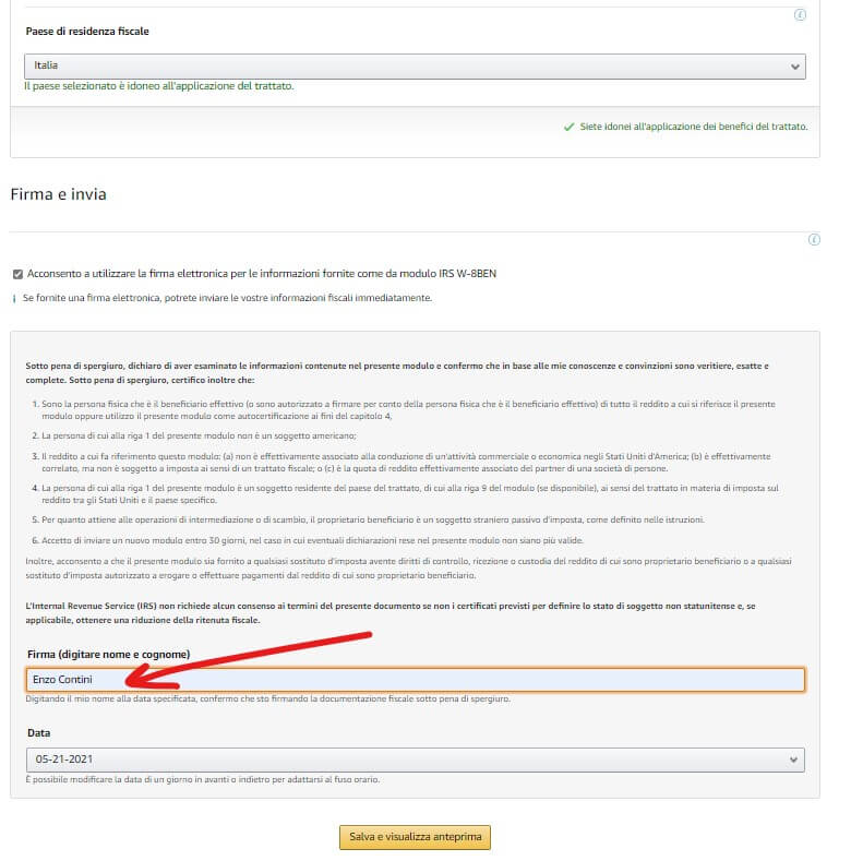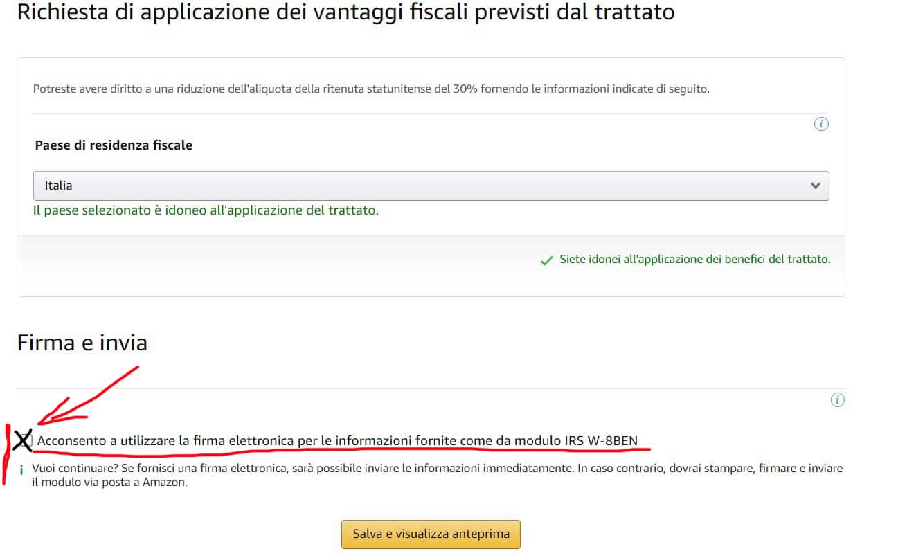 Ho già avuto modo di evidenziare nella prefazione, come anche in blog prestigiosi vengano fornite informazioni fuorvianti che derivano da un’errata comprensione della richiesta d’informazioni da inserire e delle modalità d’inoltro: infatti, quando in quel modulo Amazon si parla di firma elettronica, non si intende firma digitale. Quest’ultimo è uno strumento grazie al quale cittadini/professionisti/imprese possono firmare dei documenti elettronici con un valore legale, garantendone autenticità (assicura l’identità della persona/impresa che firma un documento), integrità (assicura che i documenti firmati non siano stati modificati dopo la firma) e non ripudio (un documento firmato tramite firma elettronica non può essere “disconosciuto” da chi l’ha firmato). Il costo per possedere e mantenere una firma digitale non tuttavia irrisorio (e.g. 50€/anno) ed è di gran lunga superiore a quello richiesto per una PEC (e.g. 10€/anno) generalmente più utile e quindi diffusa: per questo motivo, se uno non è un professionista che svolge attività che la richiedano, molto probabilmente uno non possiede un propria firma digitale! Quindi, nella compilazione di quel questionario sulle informazioni fiscali è sufficiente innanzitutto acconsentire all’utilizzo della firma elettronica per le informazioni fornite da modulo IRS W-8BEN e poi semplicemente inserire, mediante semplice input da tastiera, il proprio nome e cognome nell’apposita casella relativa alla firma. La data viene inserita già in automatico. Infine, per vedere completato con successo anche questo questionario relativo ai dati fiscali, basta confermare quei dati inseriti con un apposito pulsante! 🙂 Nel seguito mostro degli screenshot esplicativi su tutte le fasi di questo questionario: