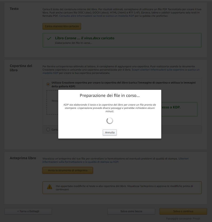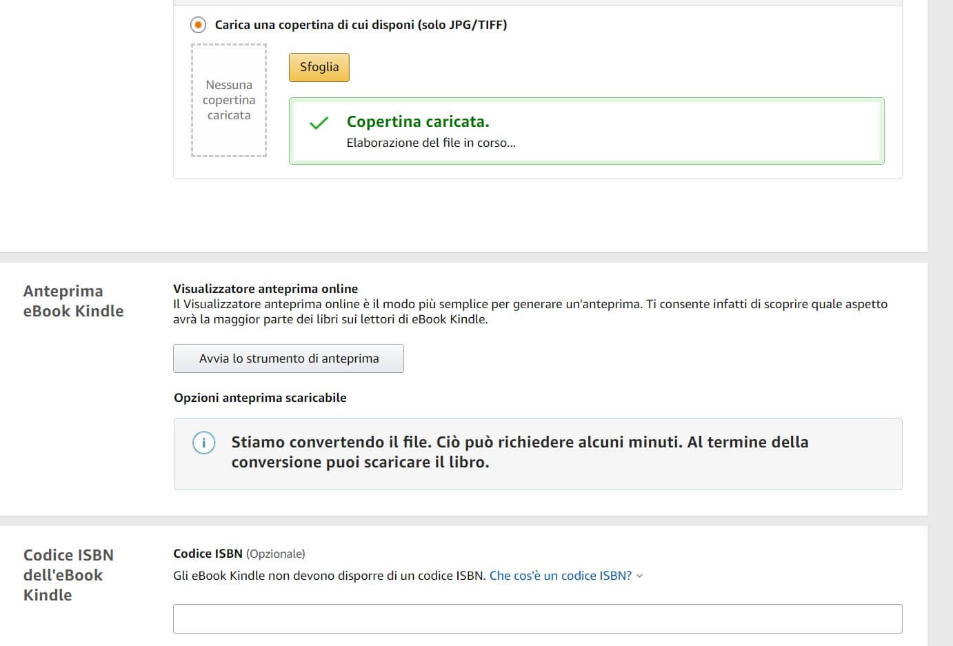 Ovviamente è necessario, dopo avere caricato sia il testo del libro sia la copertina, avviare lo strumento di anteprimaonline per verificare il risultato ottenuto e apportare le dovute correzioni a uno o a entrambi i file caricati e risolvere così eventuali problematiche. È infatti molto probabile che, da questa analisi, saltino fuori possibili correzioni sebbene non sostanziali e principalmente estetiche (e.g spaziature, colore/dimensione caratteri) che comunque conviene apportare: l’anteprima può essere visualizzata solo dopo il tempo necessario per avere, lato server Amazon, l’opportuna elaborazione dei file che si sono precedentemente caricati.