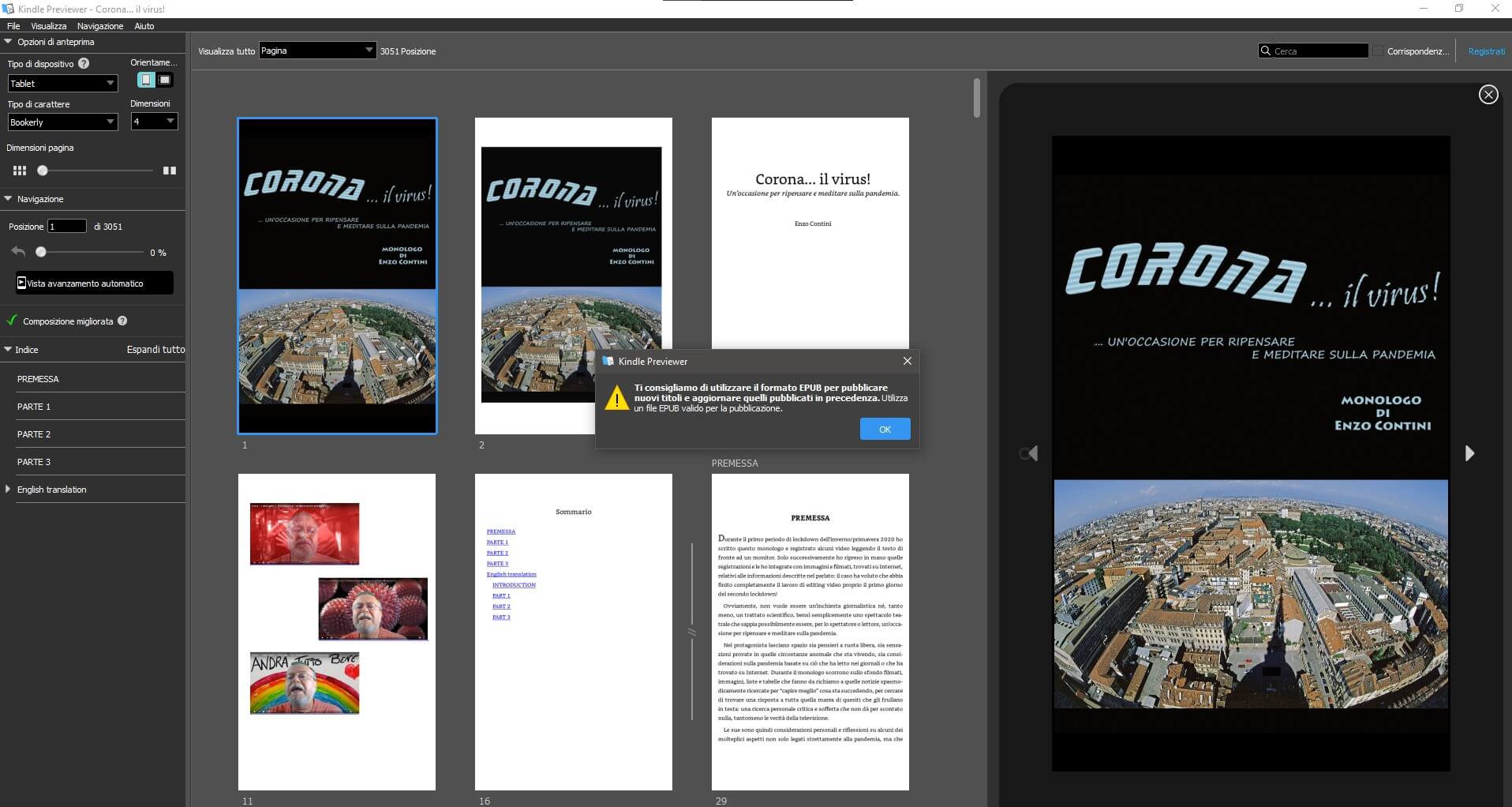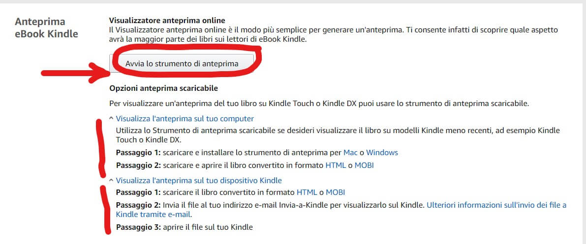 L’anteprima consente di vedere come si presenta il libro sia su un tablet sia su uno smartphone sia su un eBook Kindle: ovviamente conviene visionare tutte le pagine in tutti questi possibili formati di lettura, in quanto solo in alcuni si possono evidenziare formattazioni non appropriate, pur trattandosi del medesimo libro e la conversione appropriata sia stata generata – lato server Amazon – dal medesimo file:
