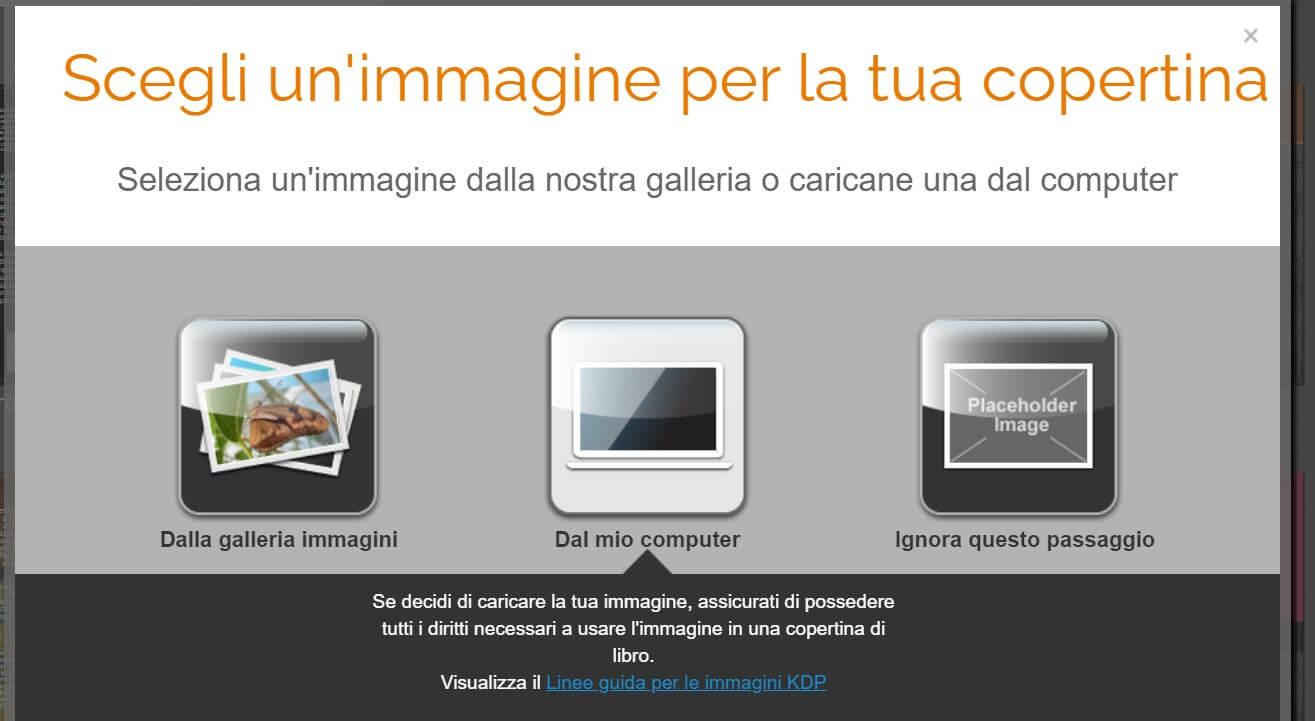 Anche se, ovviamente si può creare la copertina con uno degli innumerevoli SW di editing anche professionali, conviene comunque provare a sfruttare il tool online gratuito di Creazione– fornito dal KDP – che consente anche di caricare proprie immagini oltre che rendere disponibili già immagini della sua libreria. Infatti ho sperimentato che i risultati che si possono ottenere anche in pochi minuti sono più che soddisfacenti, posizionando già fin da subito testo, foto e immagini in posizioni convenienti, pur consentendo comunque poi una successiva eventuale personalizzazione. Le possibilità di editing non sono infinite, ma quelle essenziali penso ci siano tutte e probabilmente sono più che sufficienti per creare anche la copertina per il tuo libro!