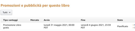 ATTENZIONE che l’inizio e la fine del periodo di promozione che uno ha selezionato fanno riferimento all’ora 00:00 per l’inizio e 23:59 per la fine relativamente all’orario del Pacifico (UTC-7): per cui inizierà in Italia alle ore 9:00 del giorno indicato come inizio e finirà alle 8:59 del giorno dopo quello indicato come fine!! Attenzione quindi a non pubblicizzare sui social la promozione del tuo libro prima che in Italia questa risulti effettivamenteattiva!!