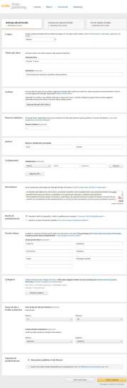 Per la pubblicazione della versione eBook Kindle, esistono le tre sezioni Dettagli eBook Kindle, Contenuto eBook Kindle e Prezzi eBook Kindle in cui si inseriscono le informazioni richieste: