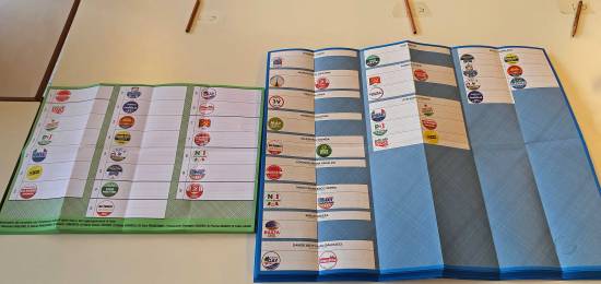 La dimensione di almeno una delle schede elettorali, quella relativa alla scelta del sindaco, era davvero impressionante, al limite del ridicolo! Le schede pubblicitarie di esempio, ricevute nelle buche, presentavano una dimensione “umana” (29×50), mentre quella reale, che uno si è poi trovato di fronte quando ha votato, era grande più del doppio: nemmeno questo potesse servire a renderla più chiara e comprensibile ai cittadini più accecati!! Quanti elettori si sono soffermati diversi minuti dentro il seggio nel tentativo di ripiegare a dovere quel papiro e quanti hanno poi comunque desistito imbucandolo malamente nell’urna dopo aver fatto del loro meglio… 🙄 La foto seguente forse non rende bene l’idea delle dimensioni delle schede (anche perché la più grande viene ritratta parzialmente piegata), ma chiunque sia andato a votare non può che essere d’accordo con me: