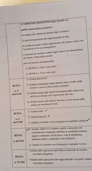 Una delle pagine del manuale che indica quali documenti inserire nelle diverse enormi buste, prima che queste vengano inserite in due grandi borsoni da portare personalmente in un luogo convenuto