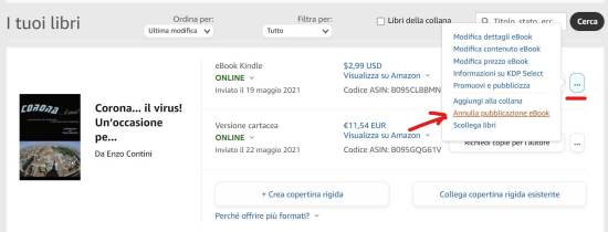 Purtroppo sottolineo nuovamente che, per una versione cartacea in cui sia stato associato l’ISBN KDP e che si desideri anche solo cambiare il titolo/sottotitolo, si può solo annullare una pubblicazione riportando il libro in stato di bozza, ma non si può più eliminare dall’elenco de I tuoi libri:
